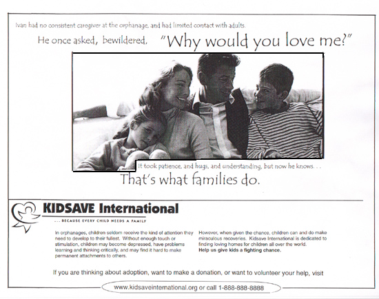 This advertisement draws from the research we did on the effects of orphanage life on children. Through reading personal stories on the web, it became clear that rasing a child from an orphanage could be challenging, but that with patience and persistance children could make miraculous recoveries. As with all of the advertisements in the awareness campaign we are trying to make people recognize Kidsave and learn what the organization is trying to accomplish. The benefits of the awareness campaign are twofold-- On the one hand it educates the public about an issue it may not have heard of-- On the other hand it gives Kidsave a professional image, which increases the chances that someone will decide to donate money or time to the cause. This ad directly asks the audience to visit Kidsave's website or to call the organization.