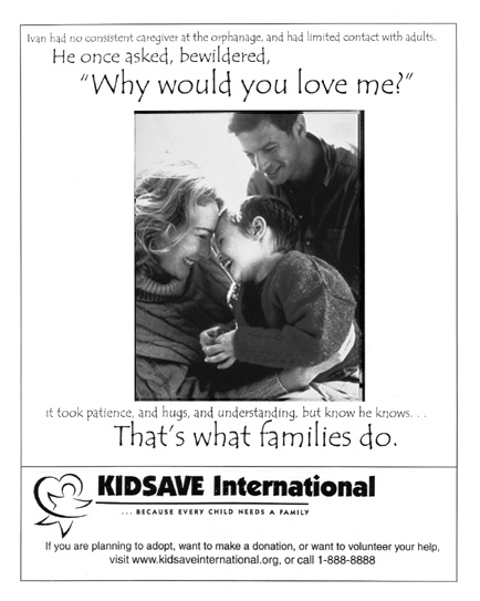 This advertisement draws from the research we did on the effects of orphanage life on children. Through reading personal stories on the web, it became clear that rasing a child from an orphanage could be challenging, but that with patience and persistance children could make miraculous recoveries. As with all of the advertisements in the awareness campaign we are trying to make people recognize Kidsave and learn what the organization is trying to accomplish. The benefits of the awareness campaign are twofold-- On the one hand it educates the public about an issue it may not have heard of-- On the other hand it gives Kidsave a professional image, which increases the chances that someone will decide to donate money or time to the cause. This ad directly asks the audience to visit Kidsave's website or to call the organization.